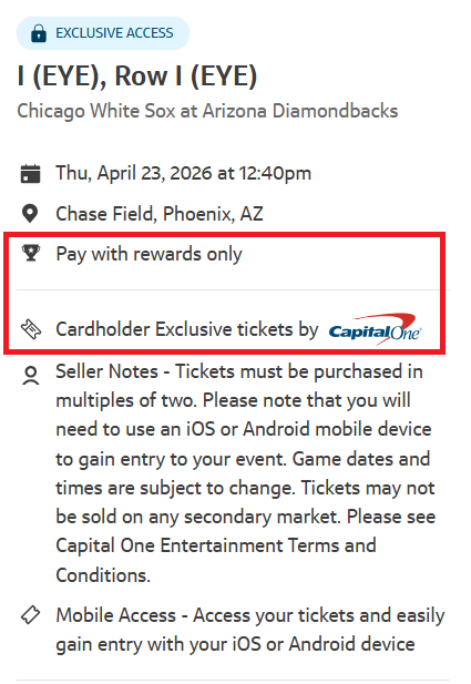 • Capital One are providing tickets to MLB video games for five,000 factors per ticket. It’s good to search for tickets that say ‘Pay With Rewards solely’ and ‘Cardholder unique tickets by Capital One’ if it says by vivid seats these are unhealthy worth.