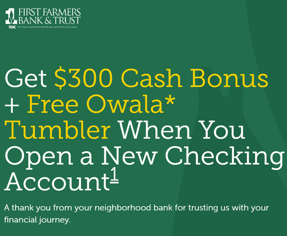 - First Farmers Financial institution & Belief is providing a $300 Money Bonus + Free Owala Tumbler When You Open a New Checking Account and full the next necessities
