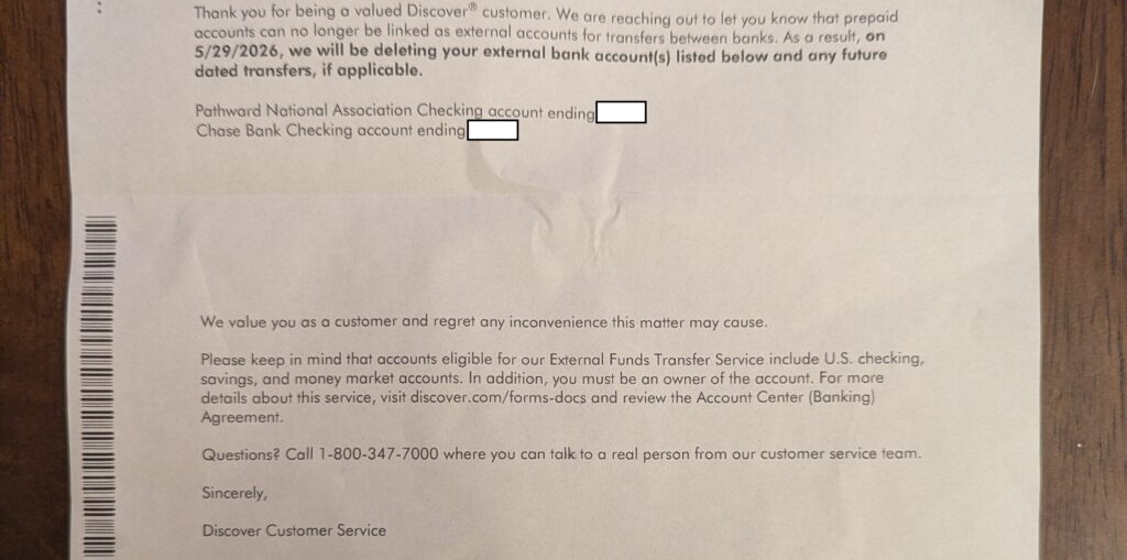 Uncover has despatched out a letter to some account holders informing them that “financial institution pay as you go accounts can not be linked as exterior accounts for transfers between banks. Because of this, on 5/29/2026, we will probably be deleted your exterior checking account(s) listed under and any future dated switch, if relevant.